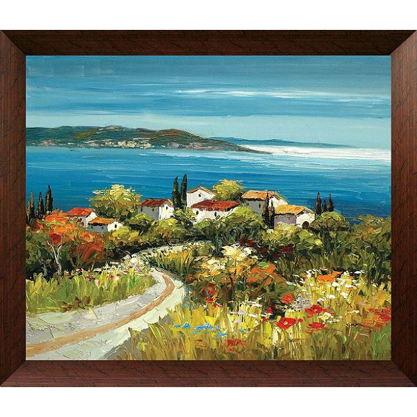 "StudioArts brings you this hand painted oil artwork of a beautiful landscape that overlooks a villa along the Oceanside. The bright blue sky and green grass would brighten up any room. The artist uses a knife edge technique to create dimension and the vibrant oil paints showcase the true value of hand painted artwork. The work is finished with a golden brown frame made of solid Pine wood. Canvas dimension is 16x20 and framed dimension is 20x24. Hardware already assembled on the back of the frame so the artwork is ready to be hung. 30 day warranty."
